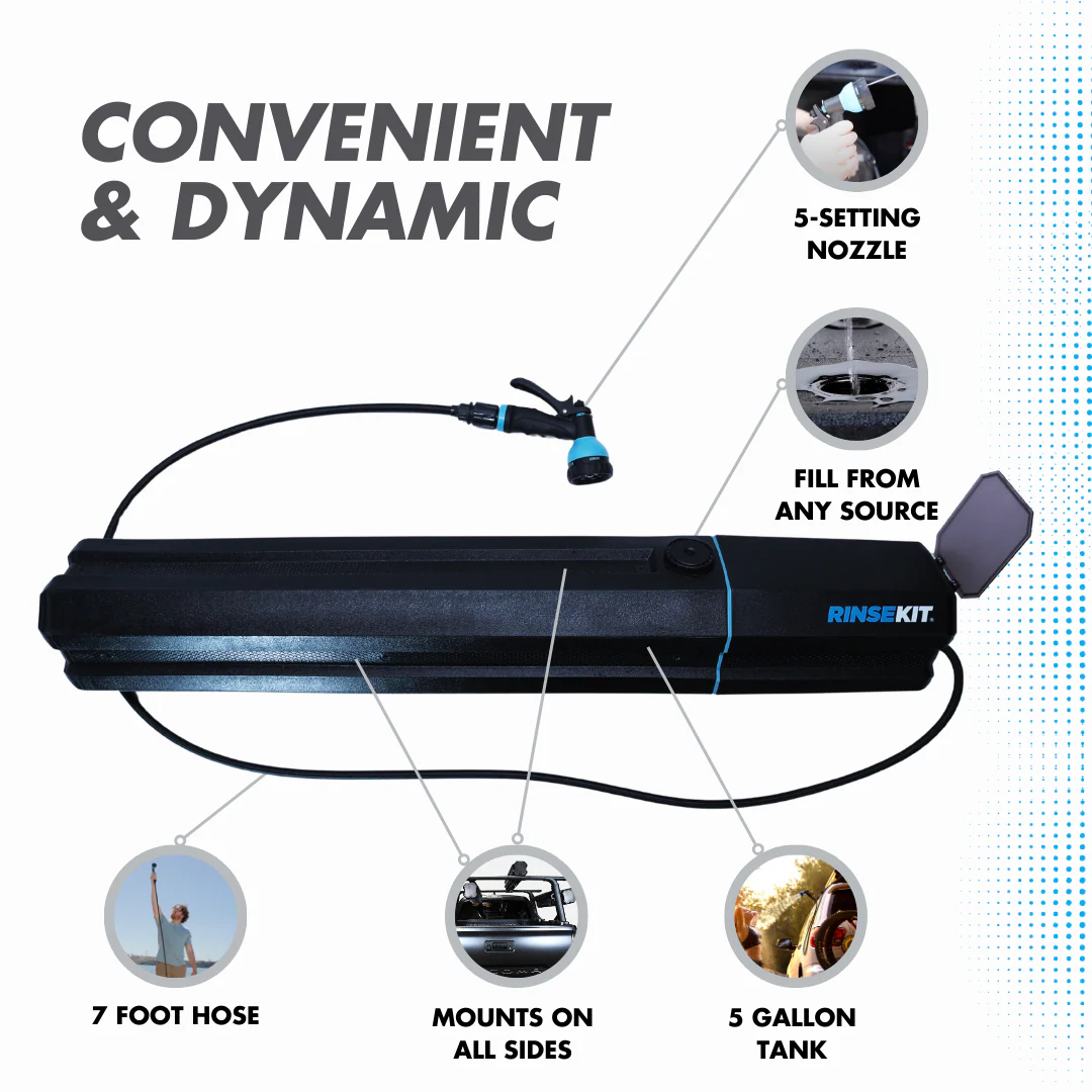Introducing the 5-gallon RinseKit Rack Shower, the world’s only completely electric mountable portable shower. Equipped with battery-powered pressurization, the Rack Shower boasts a consistent high-pressure spray so you can wash up wherever the road leads. That battery also makes it super easy to use - simply pour in water, press the power button and spray. Its built tough with military-grade materials and is mountable on all four sides so it can be attached to any rack or truck bed. The Rack Shower is designed to be the ultimate portable shower for offroad adventurers - made for going beyond the boundaries.